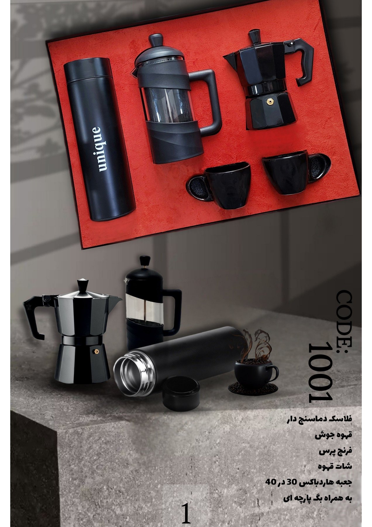 فلاسک دماسنج دار _ قهوه جوش _ فرنچ پرس _ شات قهوه _ جعبه هارد باکس ۳۰ در ۴۰ همراه با بگ پارچه ای