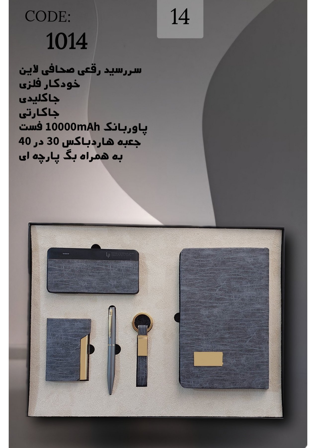سررسید رقعی صحافی لاین، خودکار فلزی، جاکلیدی، جا کارتی، پاور بانک 10000mAhفست، جعبه هارد باکس ۳۰در۴۰ به همراه بگ پارچه ای